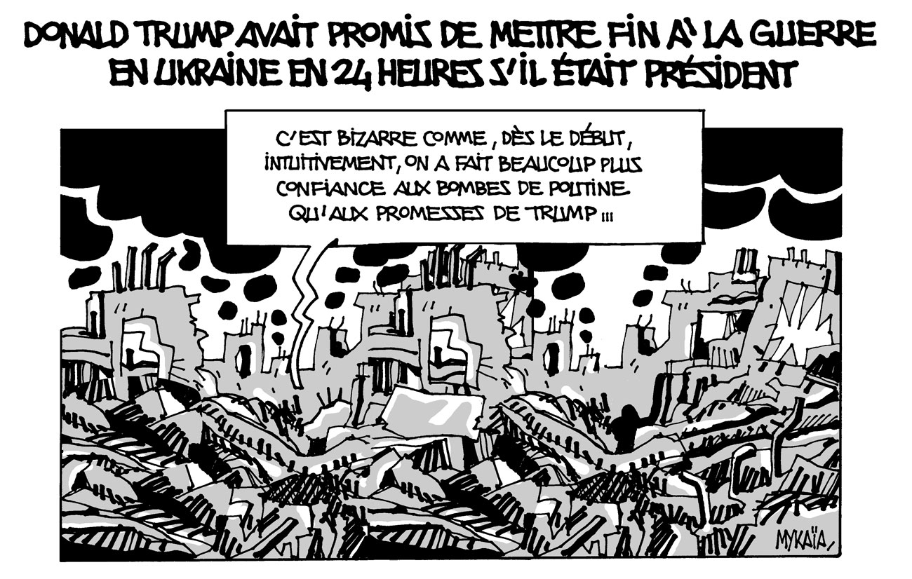 Donald Trump avait promis de mettre fin à la guerre en Ukraine en 24 heures s’il était président 15 Fév 2026, by Mykaia Tramoni-Caparros in Le Monde tel qu'il hait ShareTweetShare TAGS: 24 HEURES, CARICATURES, DESSINS DE PRESSE, DONALD TRUMP, GUERRE EN UKRAINE, MYKAïA, PRÉSISENT